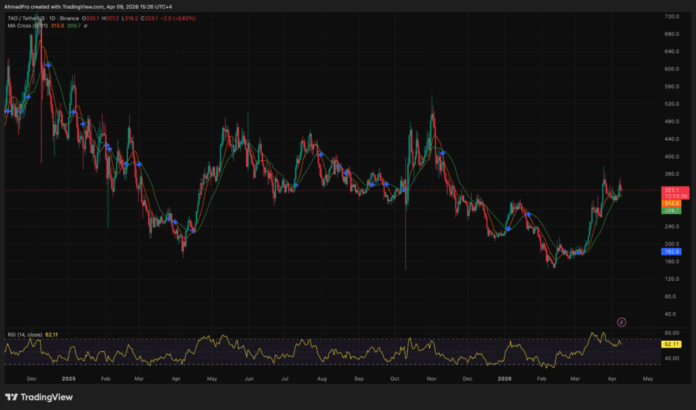 TAO crypto is currently trading at $334, up roughly 90% from its March lows, with 24-hour volume sitting at 244,000 – sustained accumulation rather than a single-session spike.