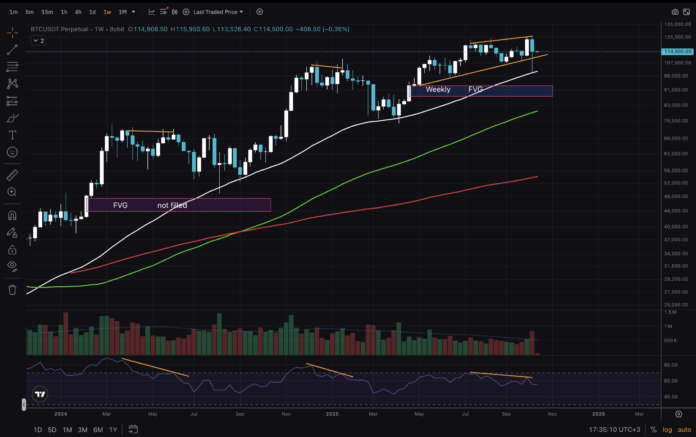 A lot of heavy buying absorbed the sell pressure from the liquidation cascade. Price wick’d down to weekly trend-line and managed to close above the $107,000-$110,000 orderblock. So far so good. But we are also below all MAs on this LTF. A reclaim of the $117,000 – $118,000 level is critical. If not – we can expect for the Weekly FVG to get filled.