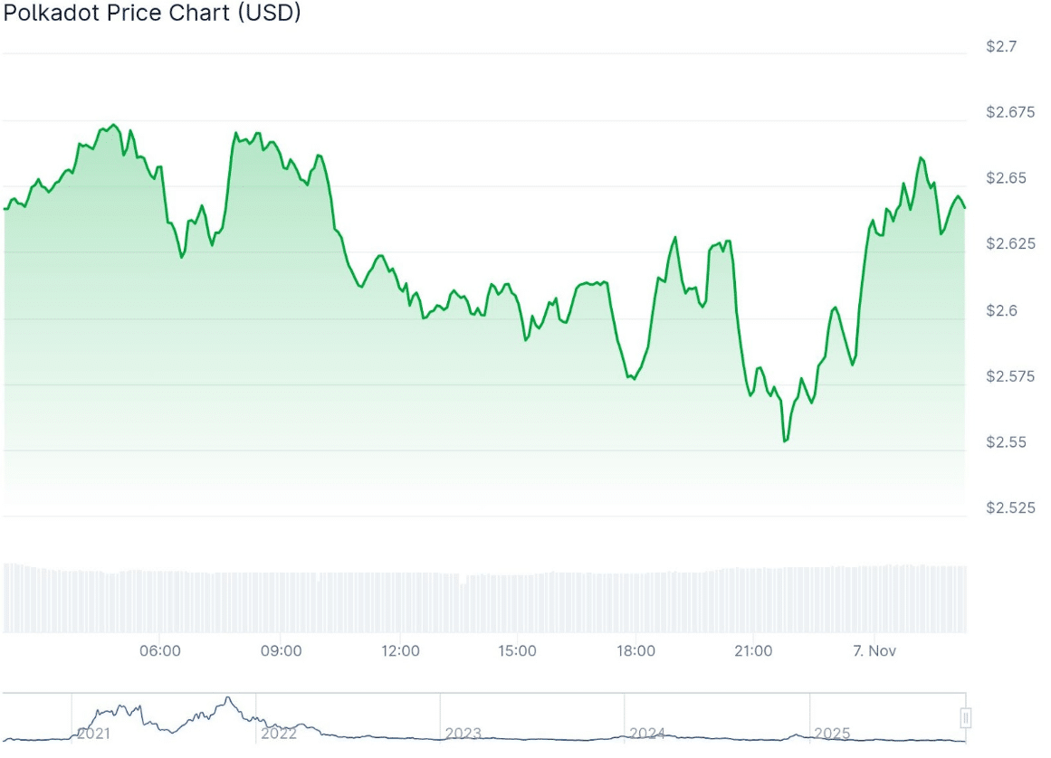 Polkadot’s DOT traded around $2.65 on Friday. The price was flat on the day while traders watched how the network settled after a major upgrade earlier in the week.