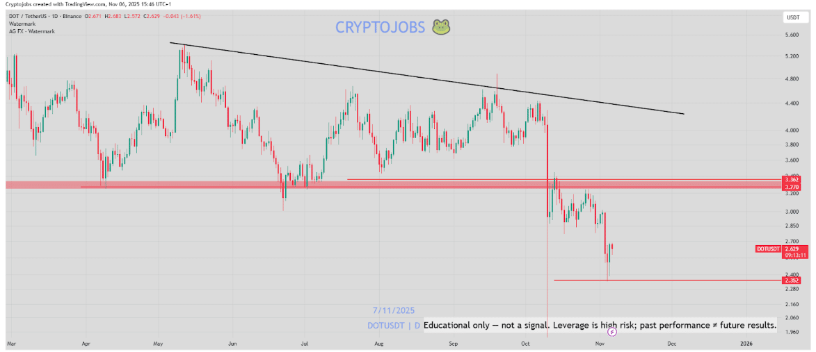 Chart readings show DOT pressed beneath key long-term resistance near $3.20 and $3.78. The market has failed to break those levels several times, which has kept upside attempts short-lived.