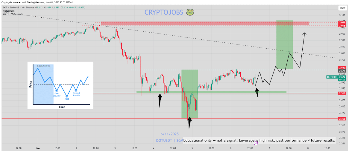 On the downside, $2.50 is the key support. If it fails, DOT may slip toward $2.35, which previously stopped sellers. A clean break under that level would raise the risk of deeper losses.