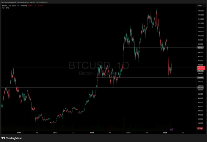 While arresting scammers and halting large Ponzi schemes are certainly important, for Bitcoin to experience a surge, it appears more catalysts are required. For Arthur Hayes, this isn’t the time to buy Bitcoin, “not even $1“. However, Bitcoin’s current setup is genuinely intriguing. The price sits at $70,174: +0.9% on the day but down over 4% in the last 7 days.