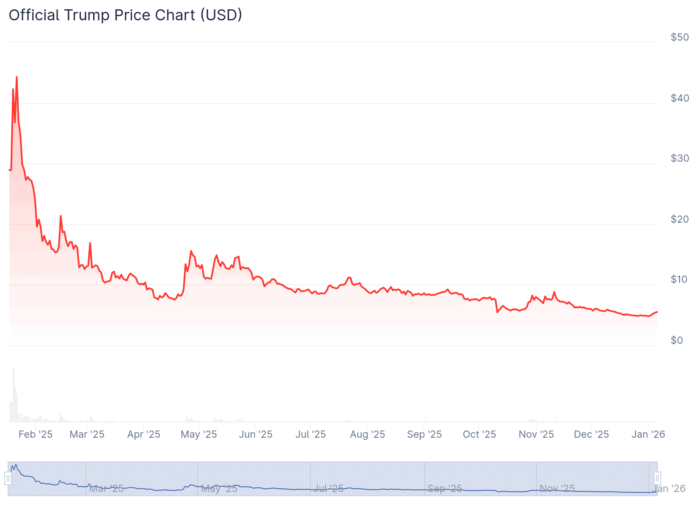 Launched days before the inauguration, the official Trump coin spiked to $45.57 and a $9 billion valuation as insiders held roughly 80% of the supply. Today it trades near $5.50, down about 88%.