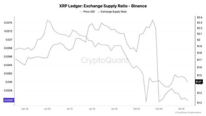 The XRP supply ratio on Binance just slipped from 0.027 to 0.025 in about ten days. That equals roughly 200M XRP disappearing from exchange order books.
