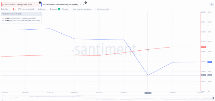 Blockchain data now shows renewed buying from major XRP holders. Wallets holding more than 1Bn tokens increased their combined balances from 25.36Bn on December 9 to 25.42Bn.